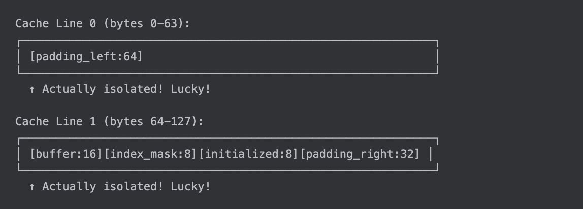 The problem: Right padding protects against fields that come after the struct (consumer_cursor is now isolated), but it doesn't protect against fields that come before the struct (producer_cursor still shares a cache line with ring_buffer).
