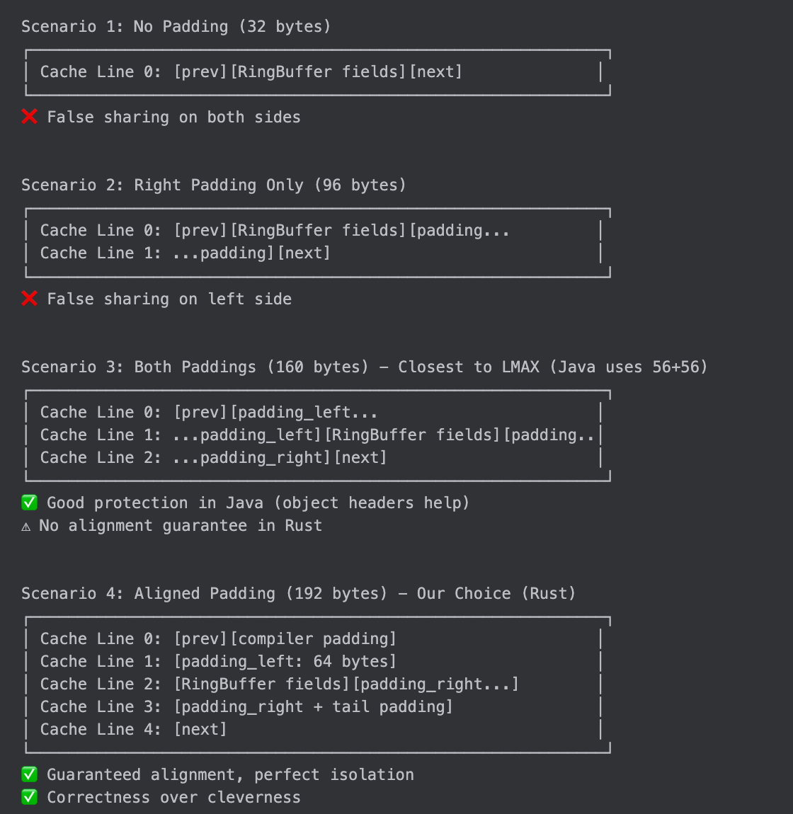 LMAX's production data: The "Both Paddings" approach (Scenario 3) delivers nearly all of the performance benefit. However, this is in Java with object headers. In Rust, we chose Scenario 4 (Aligned Padding) for guaranteed correctness.